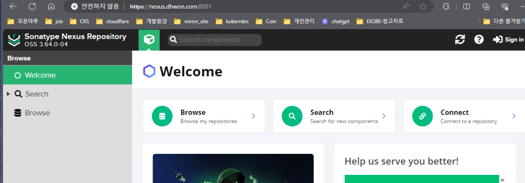nexus3는 다양한 레포지토리를 사용할 수 있는 사설 저장소 이다. maven, docker, pypi, apt, yum 다양한 패키지 저장소를 한 곳에서 관리가 가능하다는 장점을 가지고 있다.