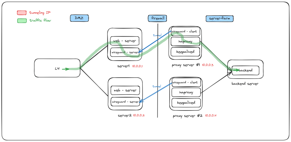 - Wireguard 터널링: 중계서버는 Wireguard 클라이언트를 사용하여 DMZ 내의 Wireguard 서버와 VPN 터널을 형성합니다. 이를 통해 암호화된 안전한 통신 채널이 구축됩니다 (Kentik).